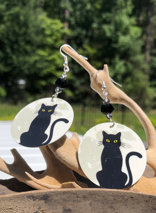 Cat and moon round Dangle Earrings with a black bead. A Unique gift idea