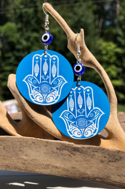 Hamsa round Dangle Earrings with evil eye beads. a Unique gift idea