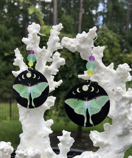 Luna moth and moon phases round Dangle Earrings with a glass beads. A Unique gift idea