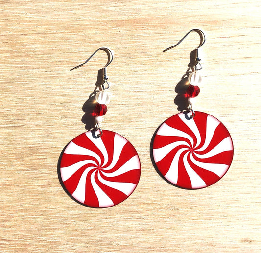 Christmas candy round Dangle Earrings with glass beads. A Unique gift idea