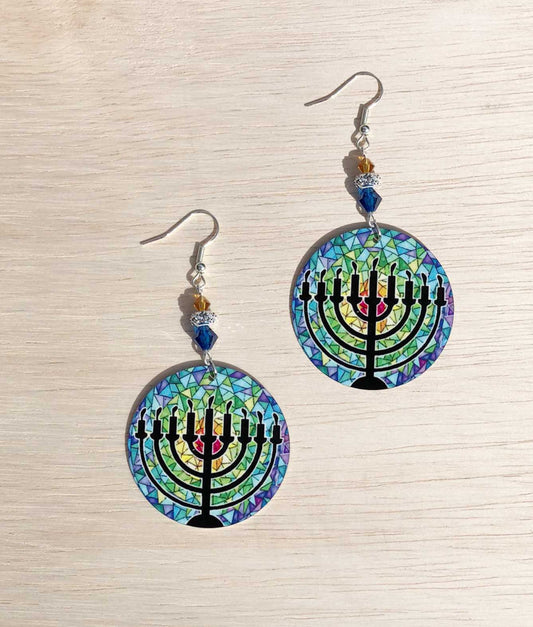 Hanukkiah a Chanukkah 9 candle menora round Dangle Earrings with glass beads. A Unique gift idea for Hanukkah