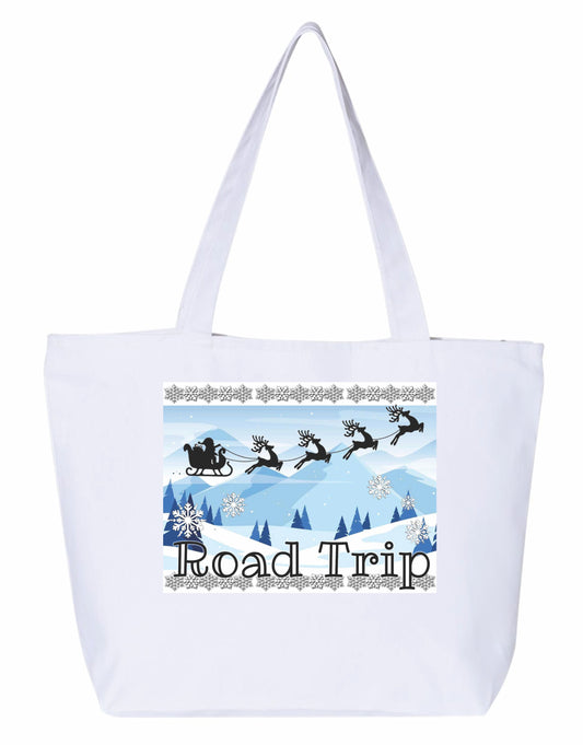 Road trip Santa sleigh, Heavy weight cotton canvas large zippered decorated tote bag a great Christmas gift