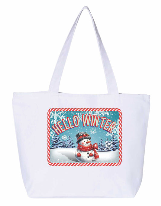 Hello winter Heavy weight cotton canvas large zippered decorated tote bag a great Christmas gift