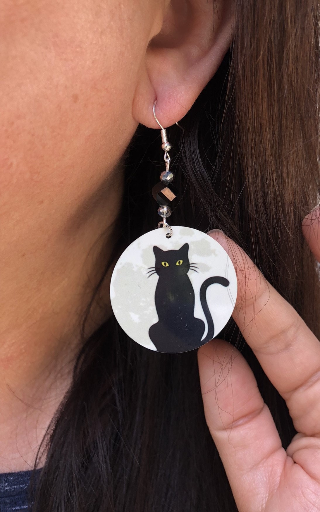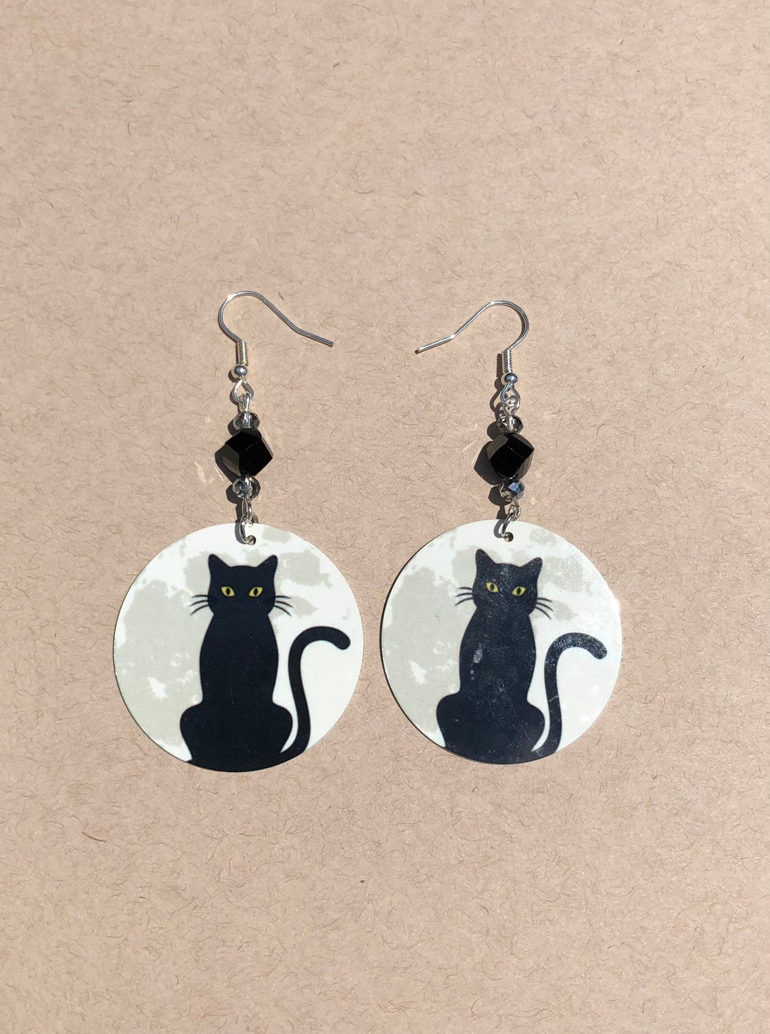 Cat and moon round Dangle Earrings with a black bead. A Unique gift idea