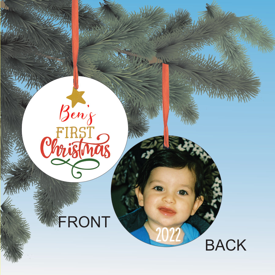 First Christmas personalized ornament with your photocan also be used as a car charm to hang from the rear view mirror