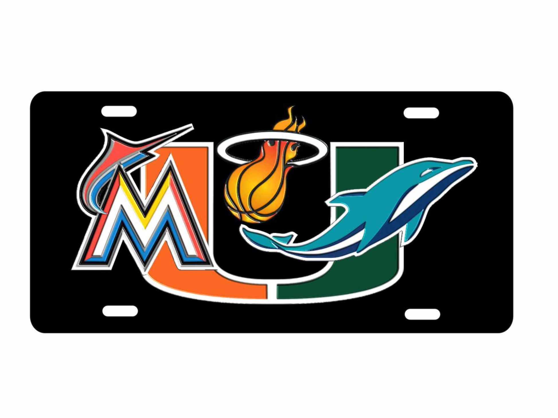 Introducing the Miami sport teams combined logos novelty license plate! Display your team pride with this decorative aluminum sign featuring combined logos of all major Miami sports teams. Made for sport fans, it's a must-have for any collection.