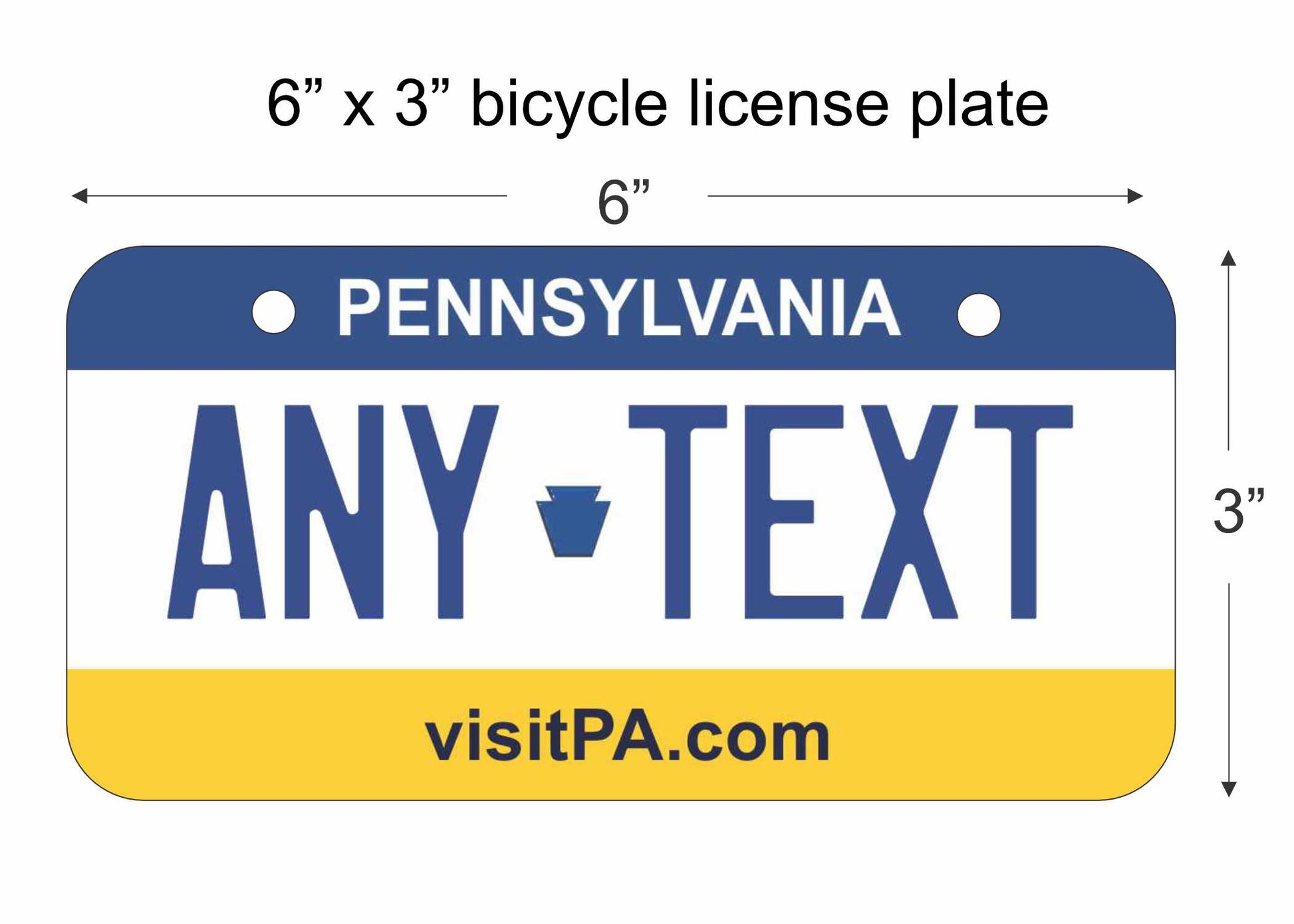 This Pennsylvania state replica bicycle license plate is not only a custom-made decorative piece, but also a personal touch to your ride. Made from durable aluminum, it can withstand any weather conditions. Perfect for adding a unique touch to your bike, this plate can be personalized with any text you choose.