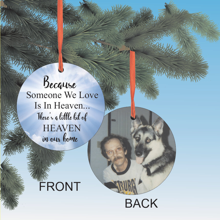 This memorial ornament serves as a touching tribute to a loved one who has passed away. It features a personalized photo and the heartwarming phrase, "Because someone we love is in heaven there's a little bit of heaven in our home." Keep their memory alive during the holiday season with this special ornament.