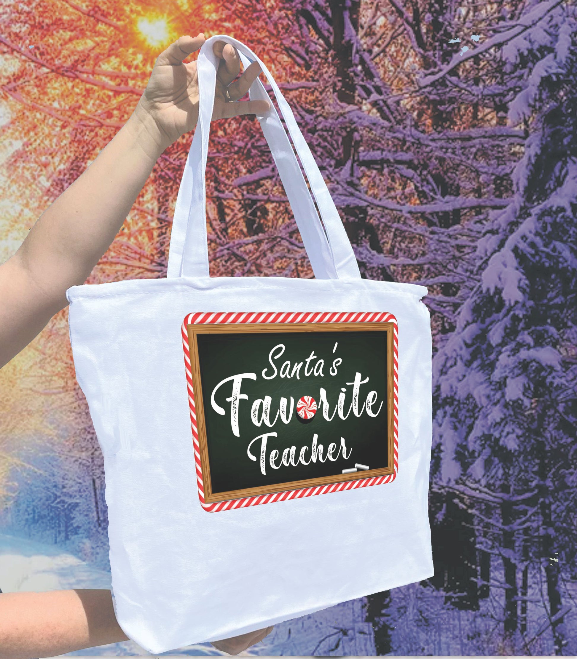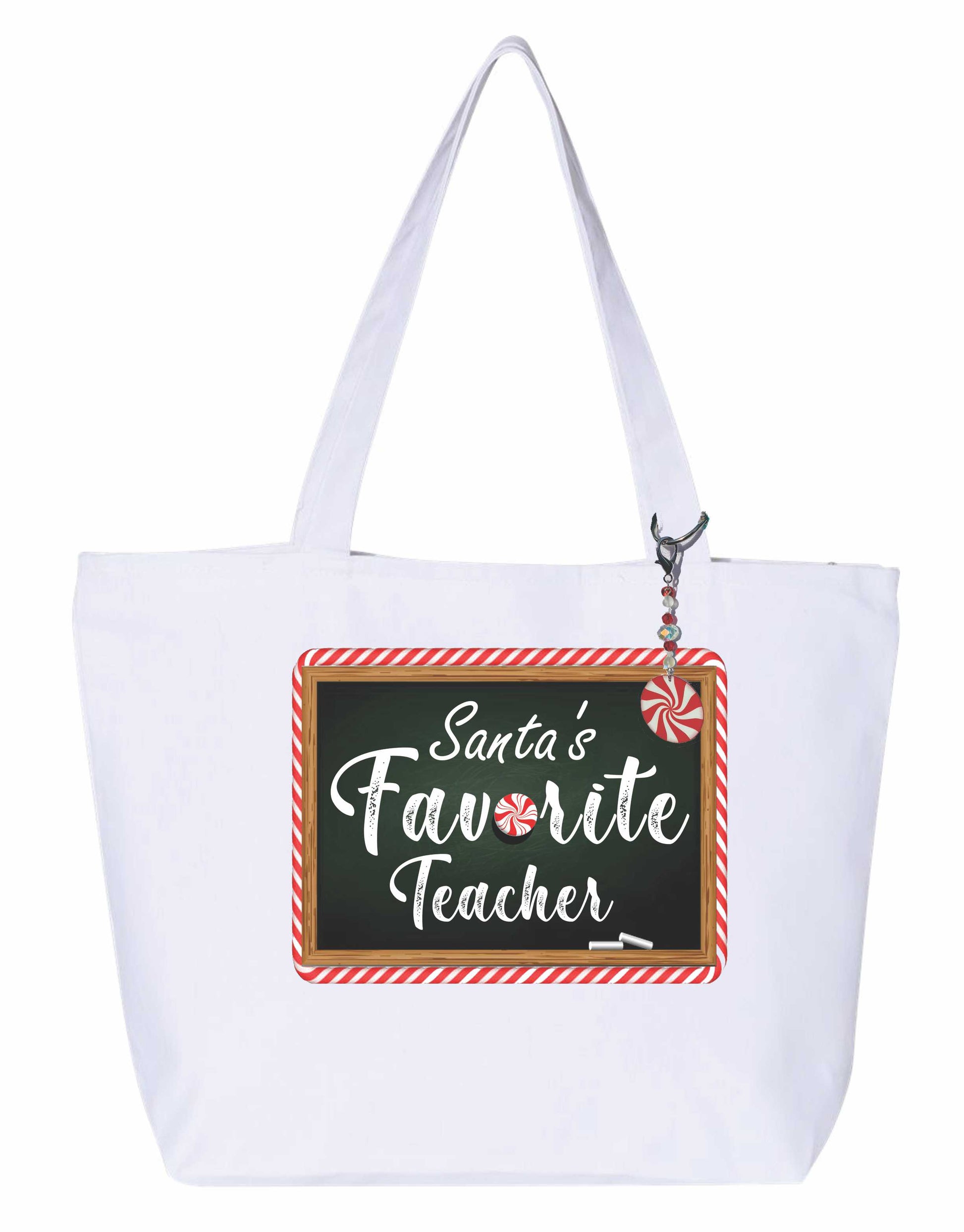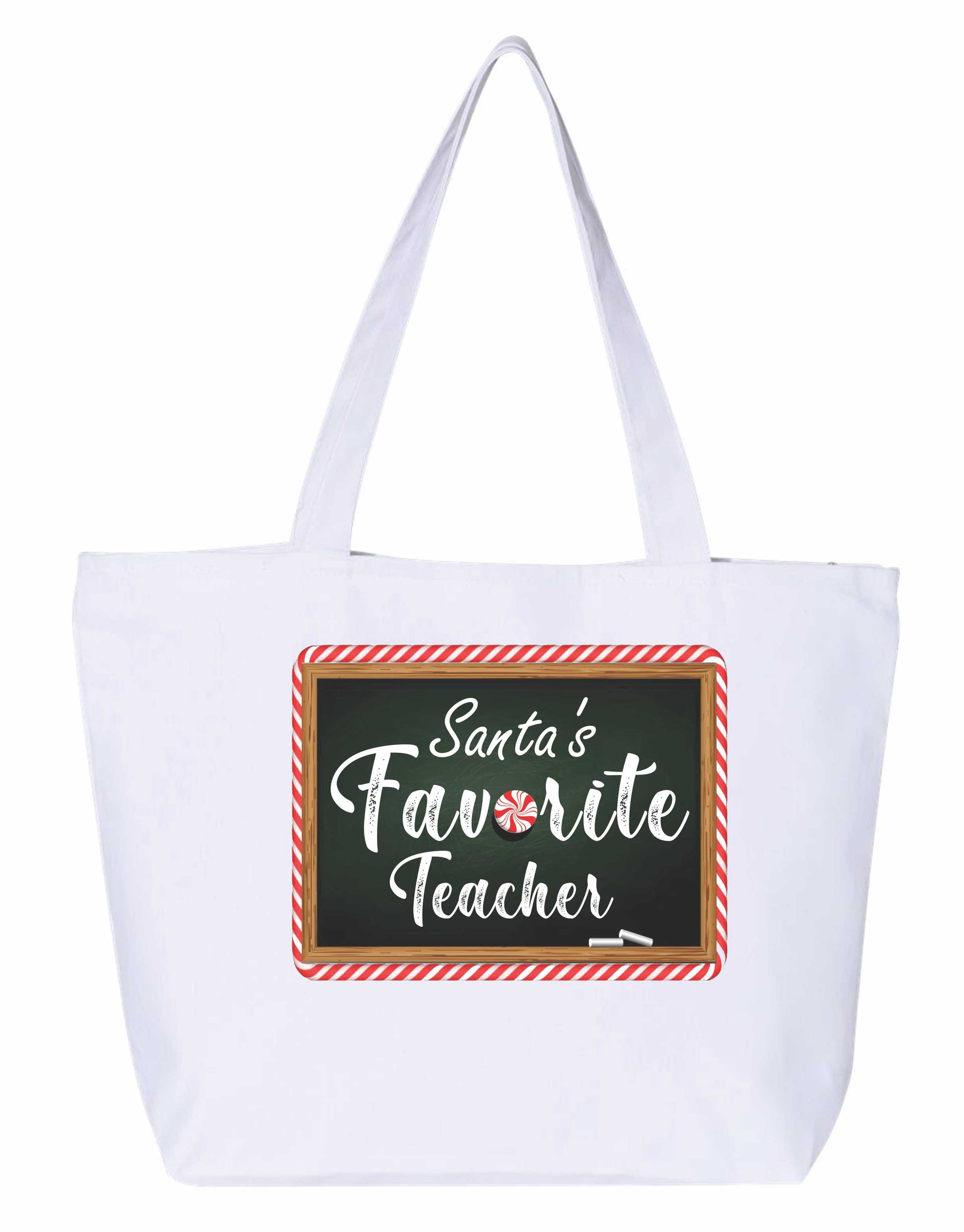Santa's favorite teacher Heavy weight cotton canvas large zippered decorated tote bag a great Christmas gift for a teacher