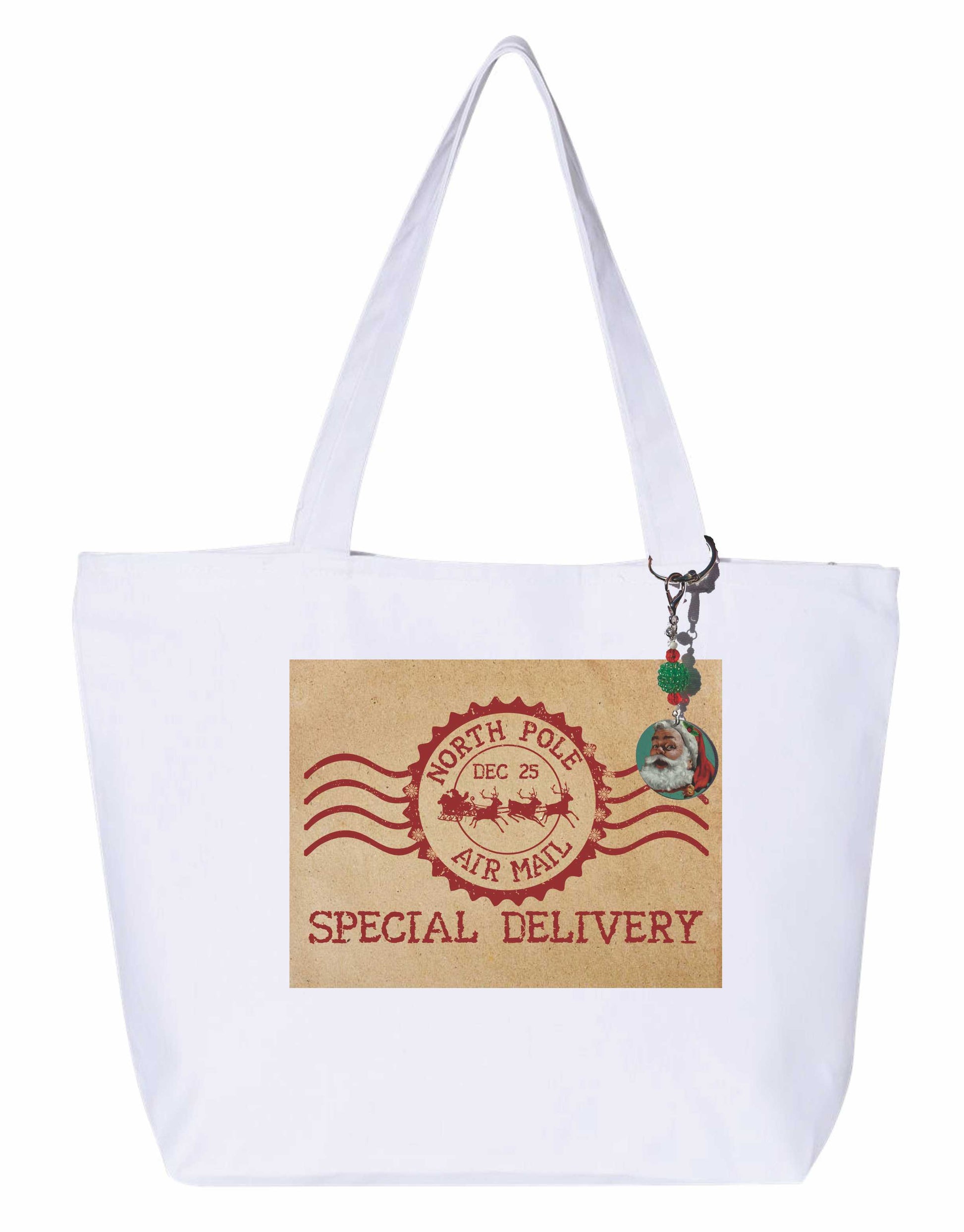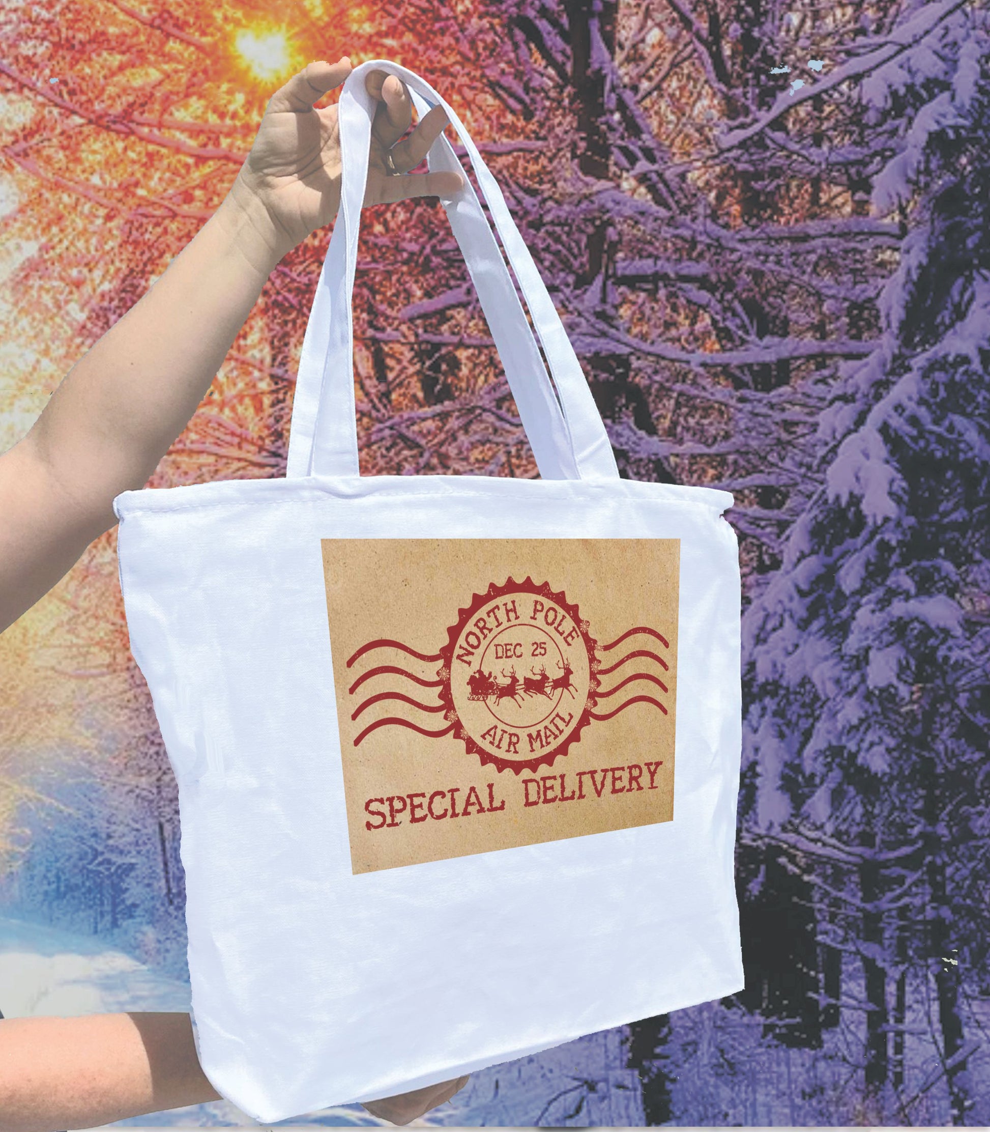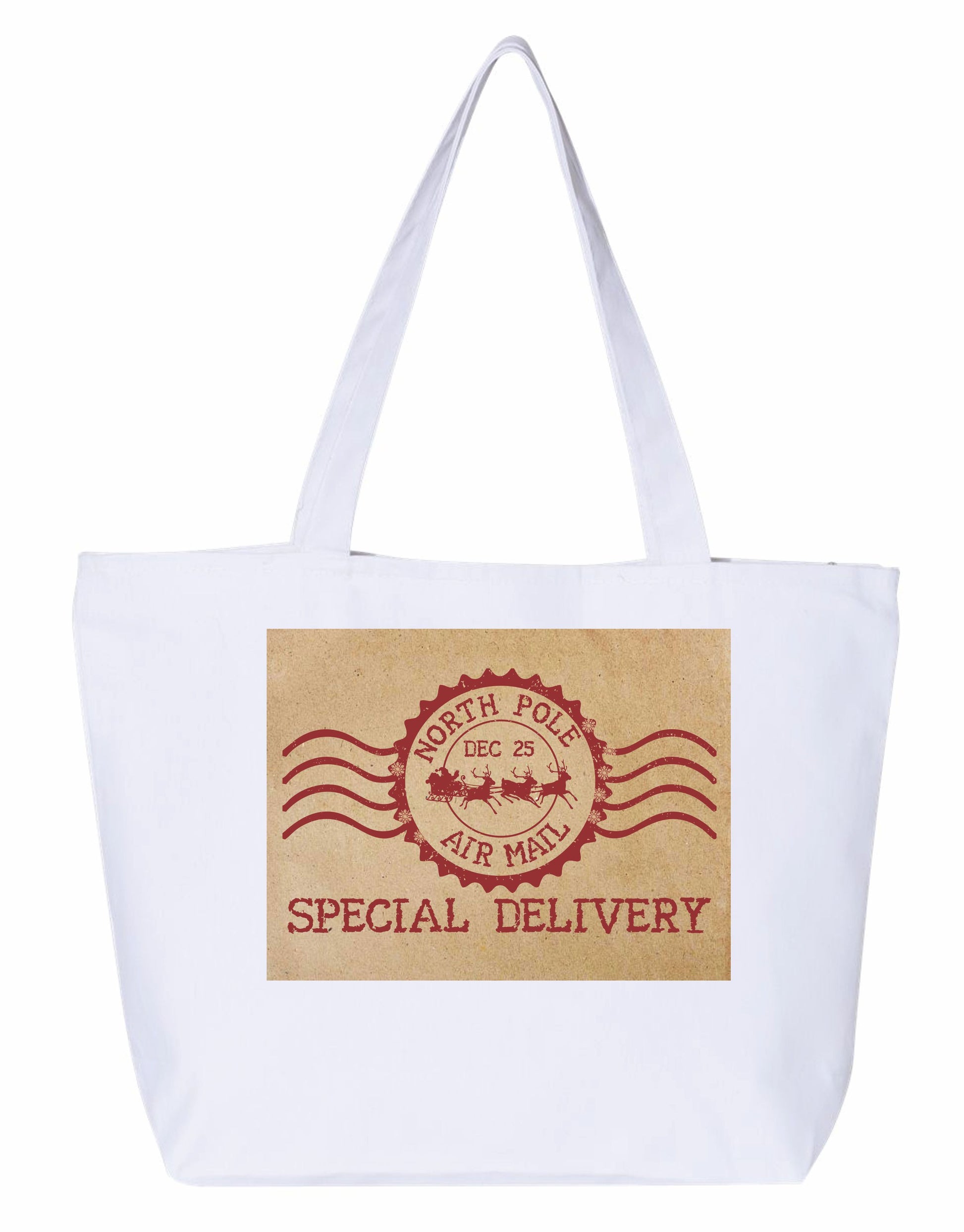 North pole postage stamp, air mail, special delivery, Heavy weight cotton canvas large zippered decorated tote bag a great Christmas gift