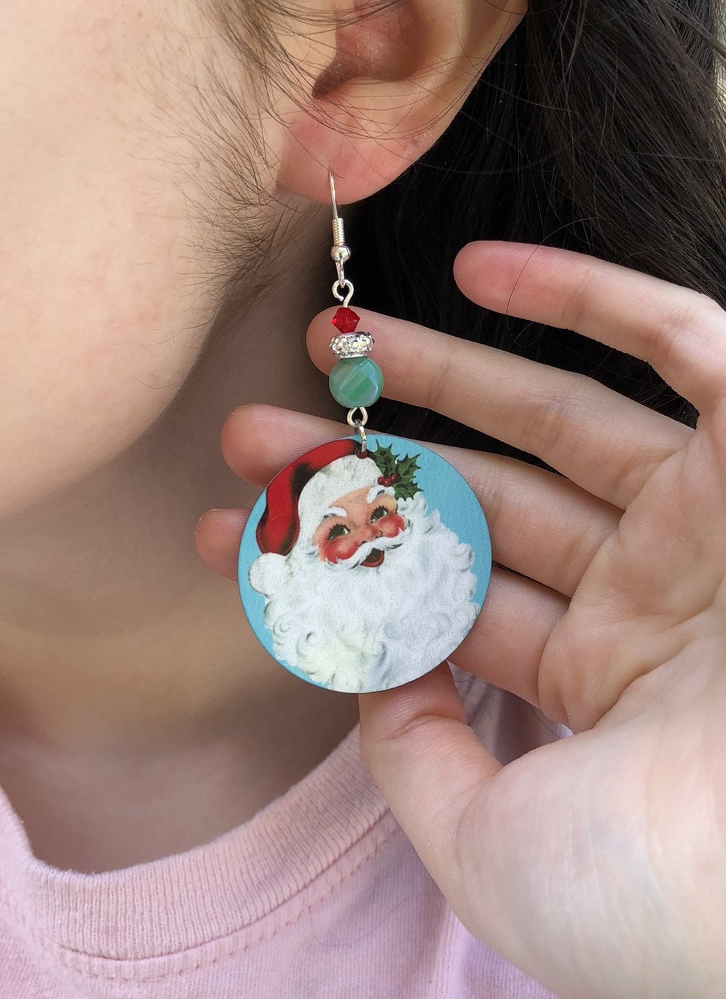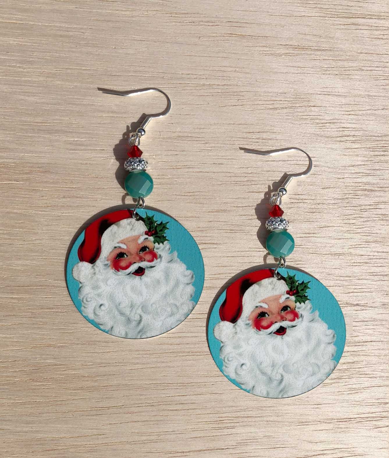 Holly jolly Santa Claus head round Dangle Earrings with glass beads. A Unique Christmas gift idea