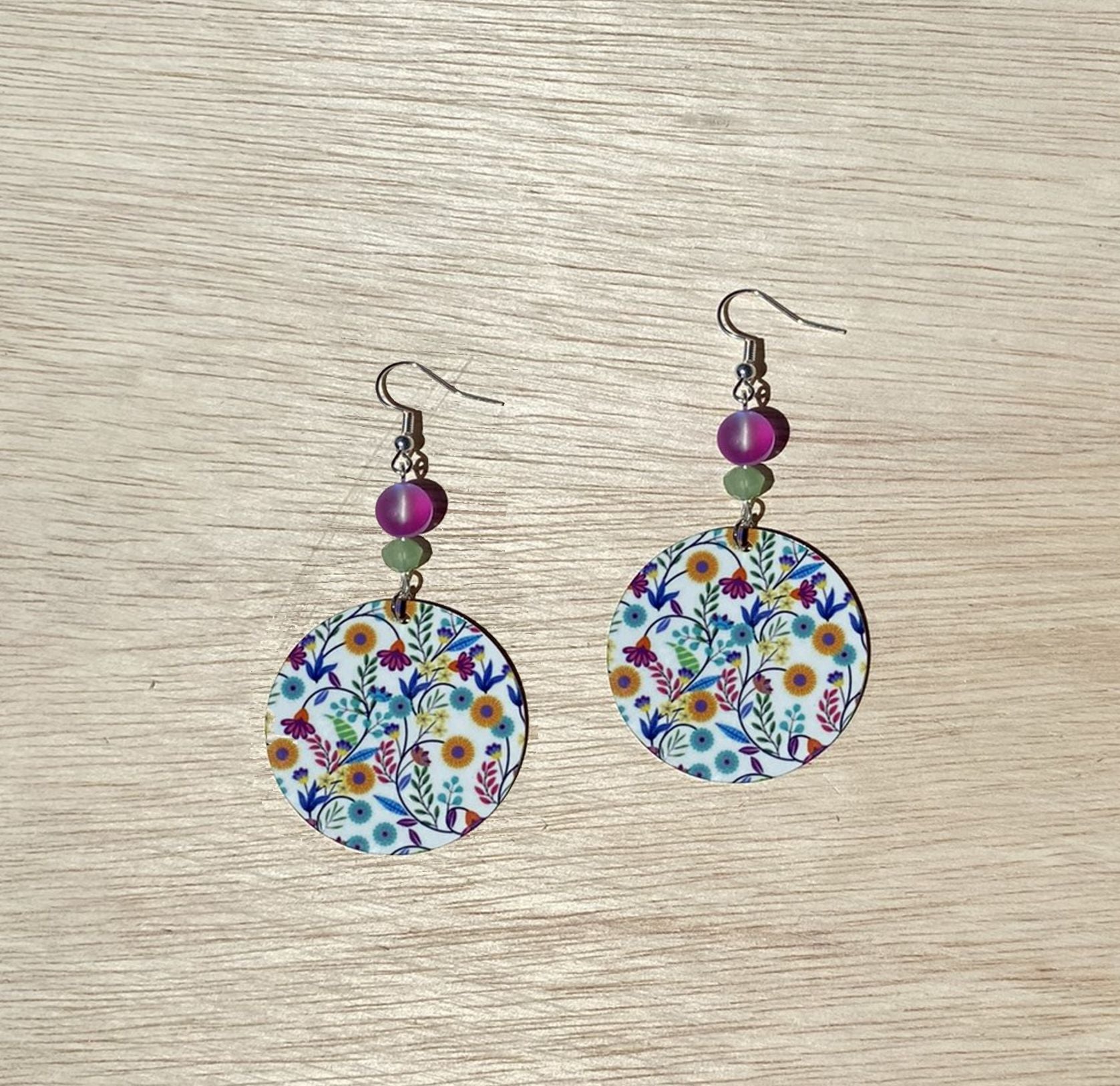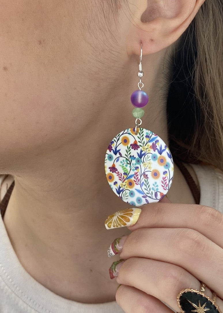 flowers wallpaper round Dangle Earrings with a glass beads. A Unique gift idea