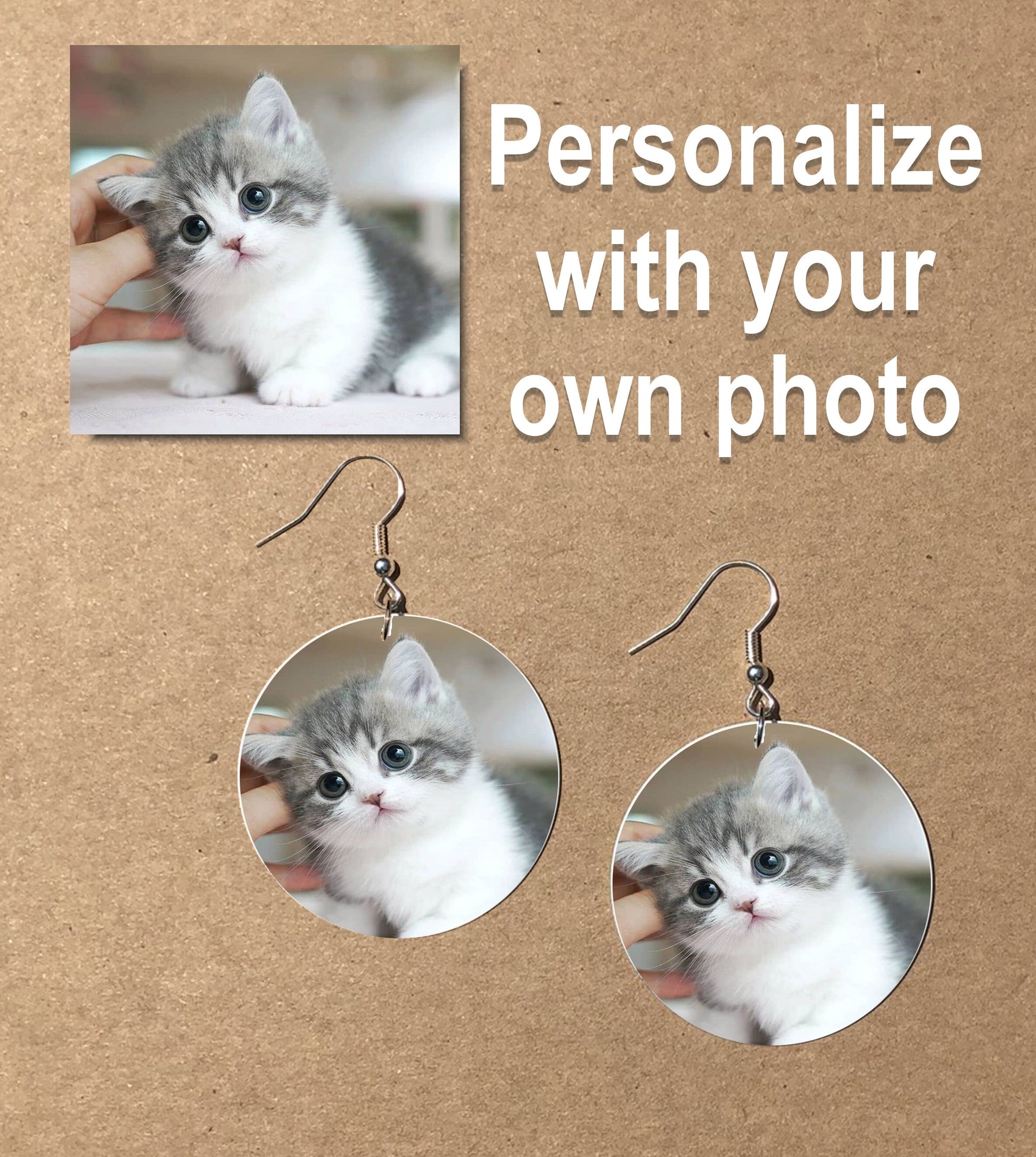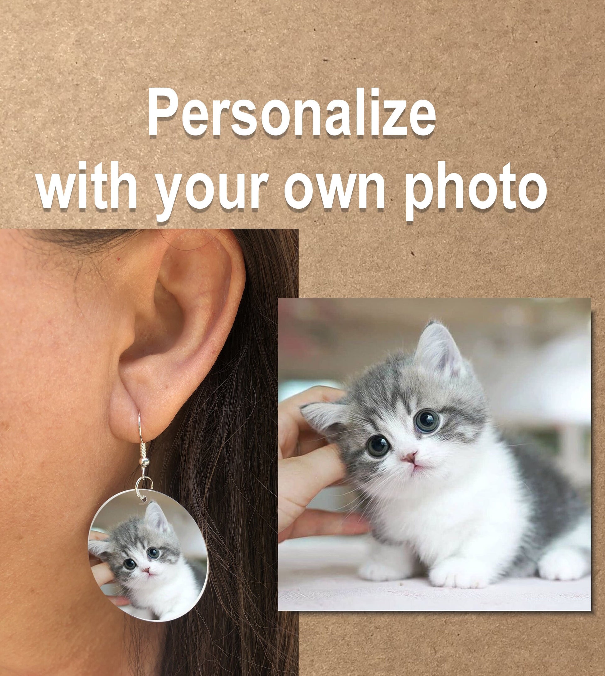 These custom-made photo round dangle earrings are a unique and personalized gift idea. Upload your own photo and make it a special and meaningful accessory. Crafted with your own photo, these earrings will be a cherished possession for years to come.