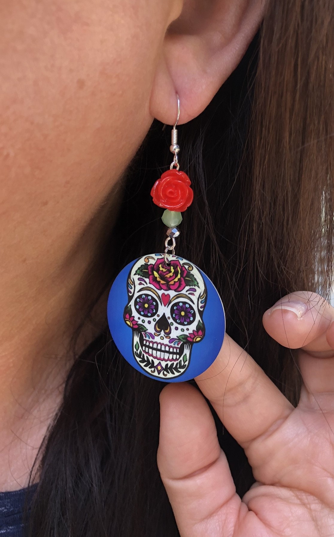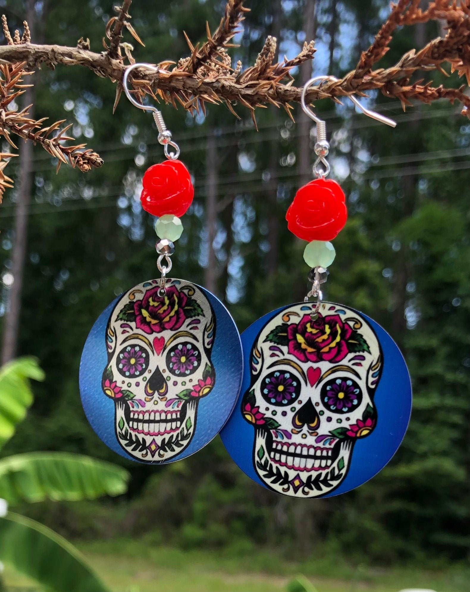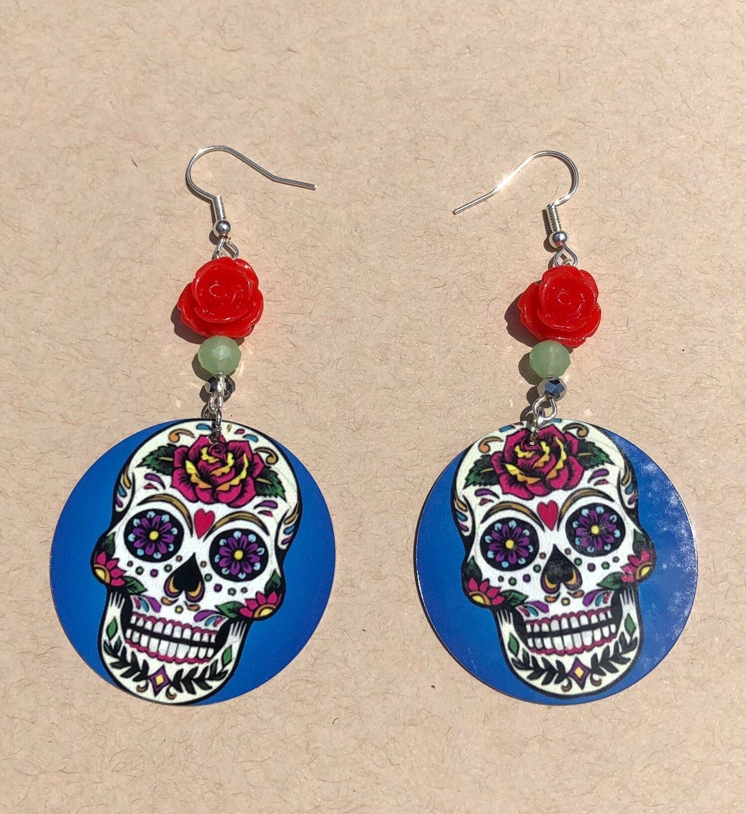 Sugar skull round Dangle Earrings with a red rose bead. A Unique gift idea