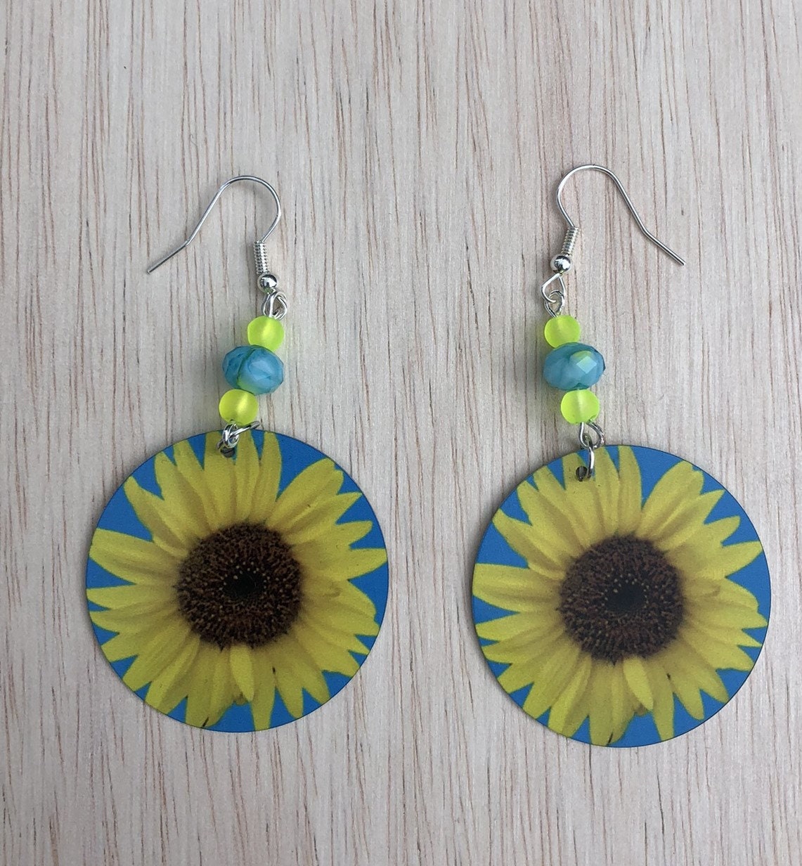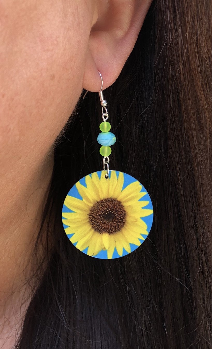 Sunflower round Dangle Earrings with a glass beads. A Unique gift idea