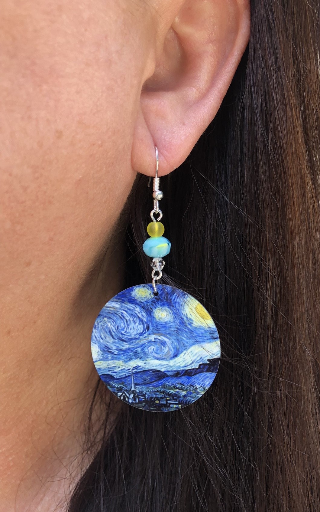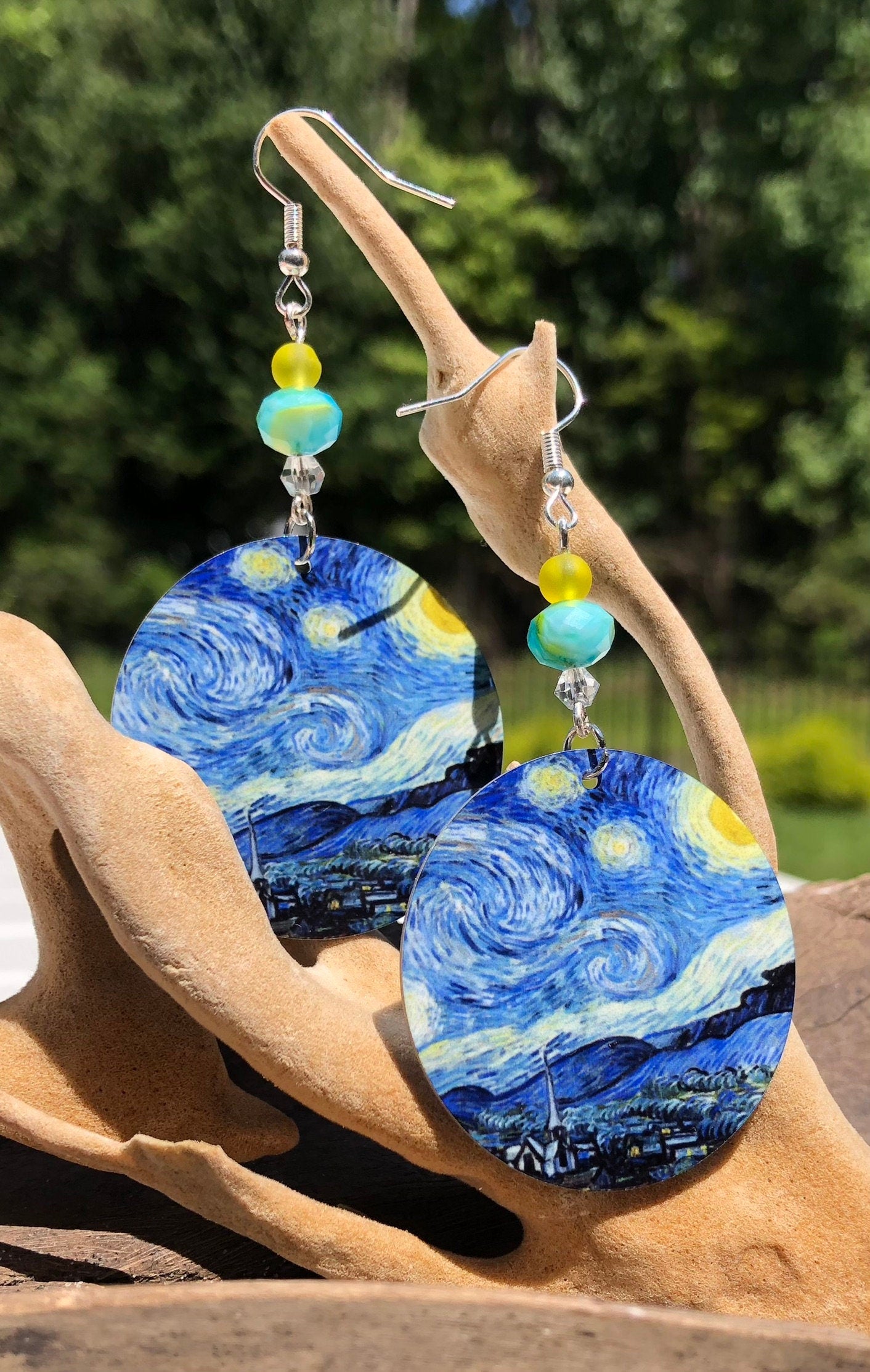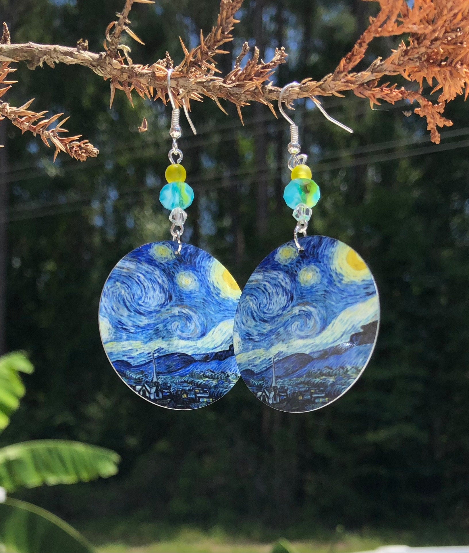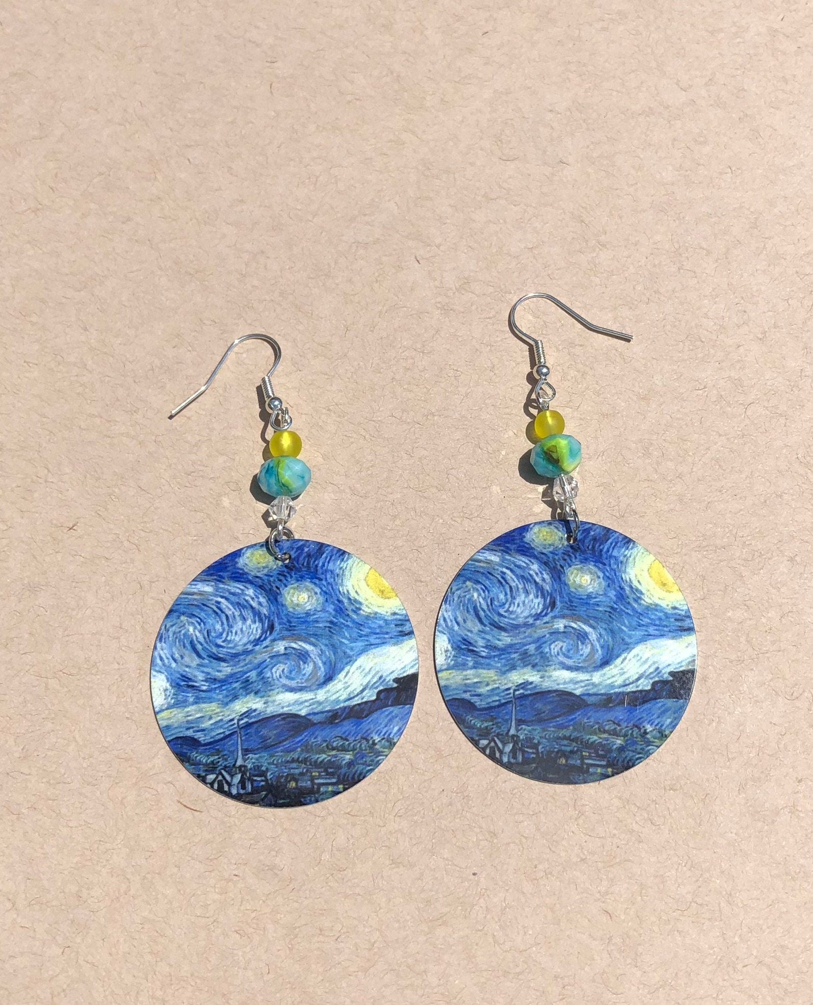 Adorn your ears with the beauty of Van Gogh's starry night with our dangle earrings. Made with glass beads, these earrings are a unique gift idea for any art lover. Add a touch of elegance and creativity to your outfit with these round dangle earrings.